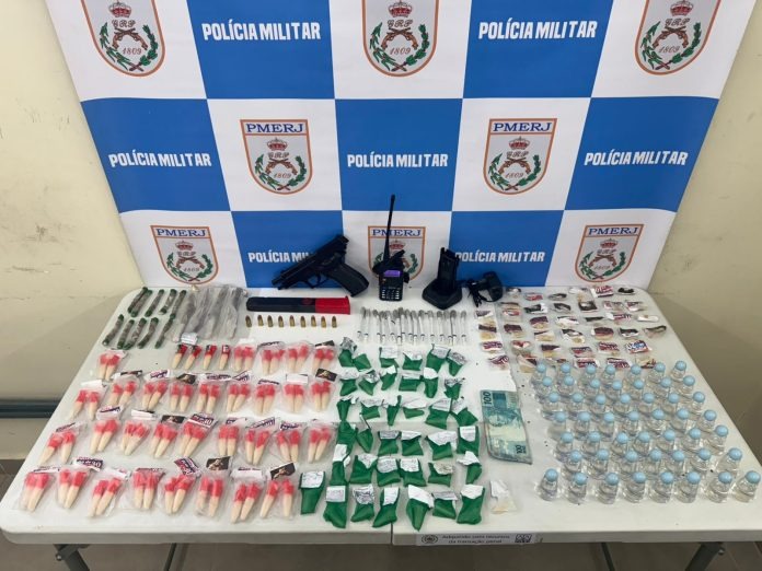 Ao chegarem ao local, os policiais militares encontraram participantes em fuga e apreenderam um saco preto contendo 104 pinos de cocaína, 14 tiras de maconha, 38 pedras de crack, um rádio transmissor, um carregador e uma bateria de rádio, R$ 100 em dinheiro, um simulacro de pistola e um carregador alongado de pistola calibre 9 mm com nove munições intactas.